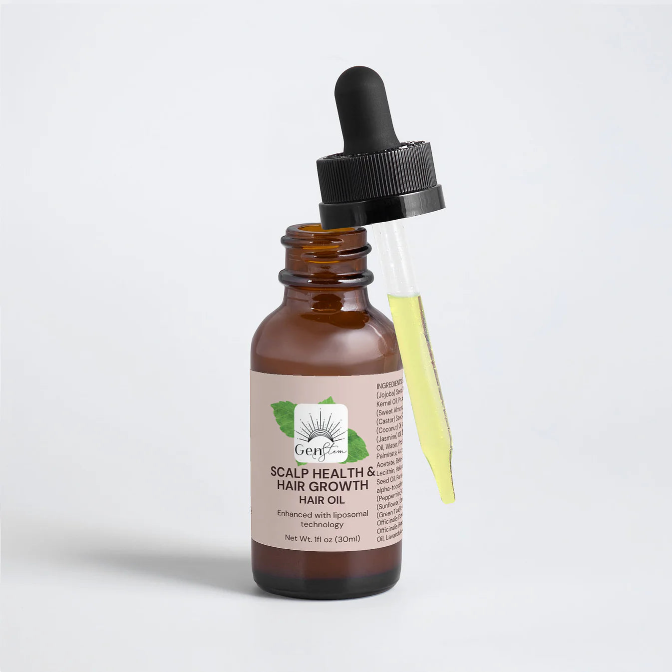 GenStem Hair Growth Oil: Pamper your scalp and hair with our luxurious blend of natural oils. Featuring argan oil, jojoba oil, and coconut oil, this hair growth oil hydrates and nourishes your scalp, reduces flakiness, and promotes healthy hair growth. It also helps repair damaged hair, reduce split ends, and add a natural shine. Free from artificial additives and harsh chemicals, our hair oil provides the pure, effective care your hair deserves.