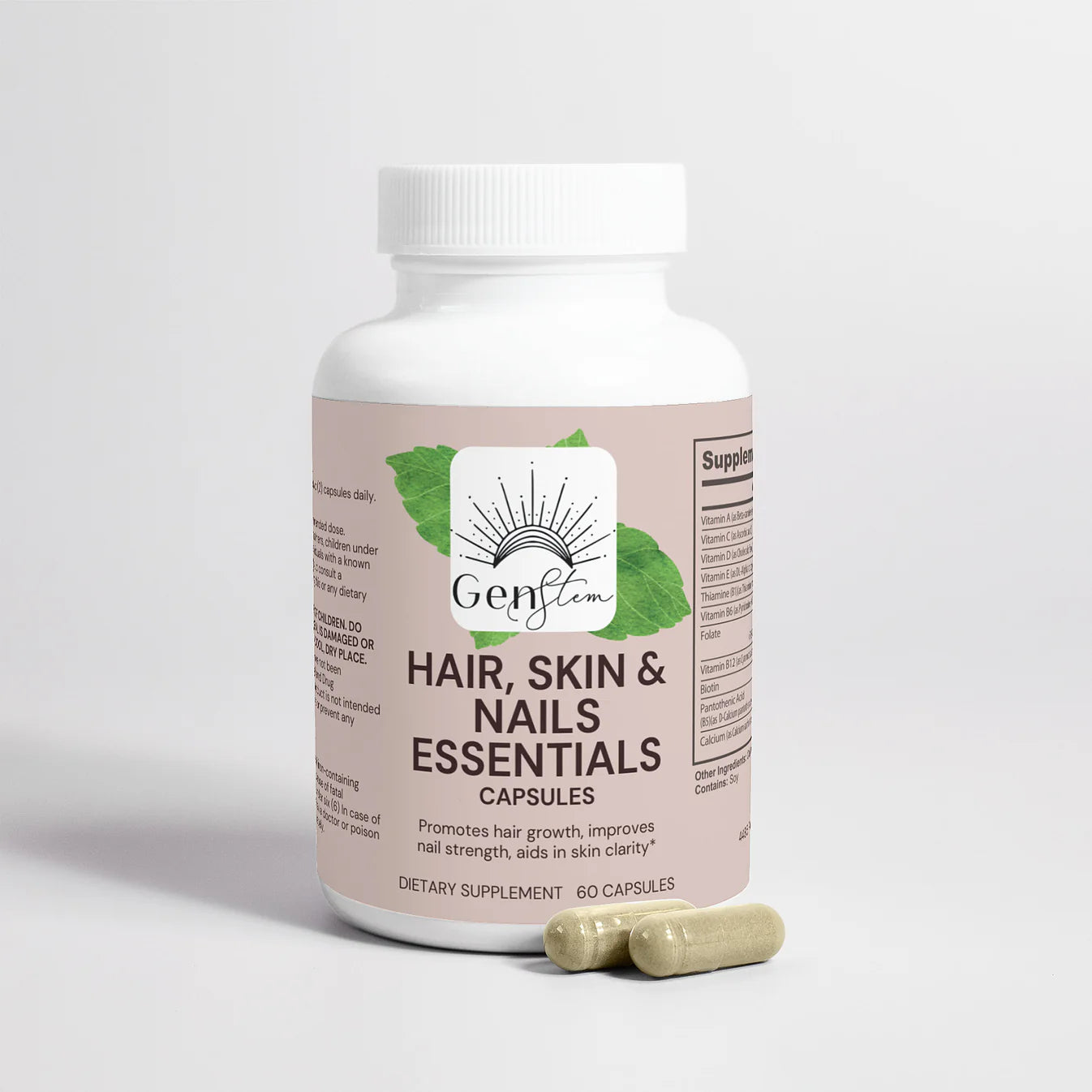 GenStem Hair, Skin, and Nails Supplements: Enhance your beauty from within with our powerful supplement. Packed with essential vitamins and minerals like Vitamin A, Vitamin C, Vitamin D, and Vitamin E, it supports overall skin health. Thiamine (B1), Vitamin B6, Folate, Vitamin B12, and Biotin work together to strengthen hair and promote nail growth. Our proprietary blend features natural extracts like Horsetail, Bamboo, and Saw Palmetto, known for their beneficial effects on hair and skin health. Free from artificial additives, our supplement ensures you receive pure, effective ingredients for radiant health.